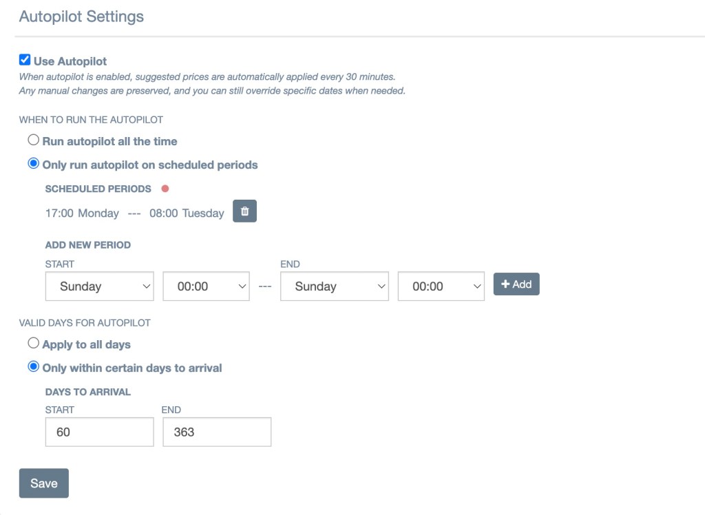 We have, once again, made improvements to the Autopilot. Now, you can choose whether you’d like to run the Autopilot on all days, or if you want to run it within a certain number of days to arrival. This allows you to, for example, automate pricing closer to arrival, while still keeping full control of dates further out.